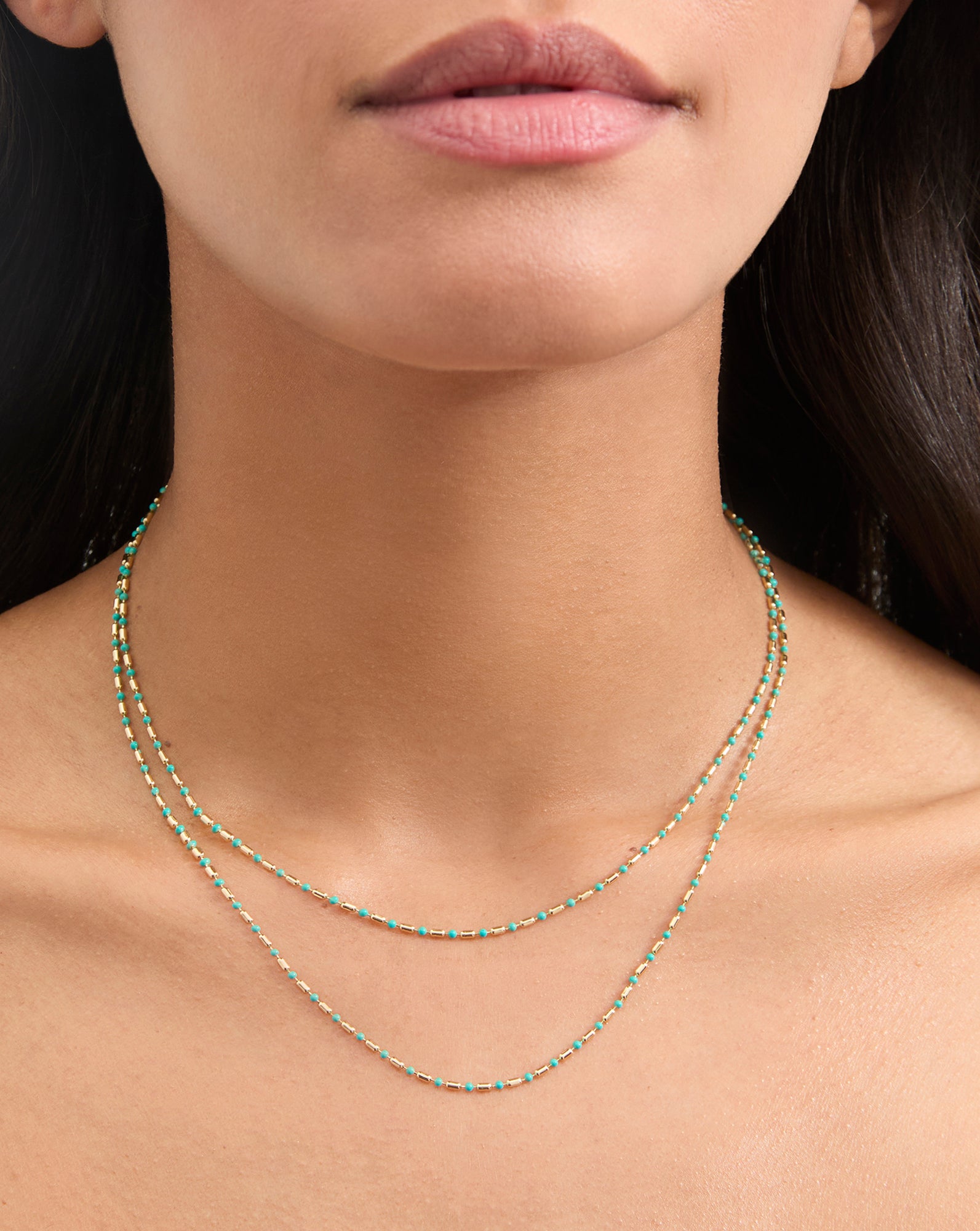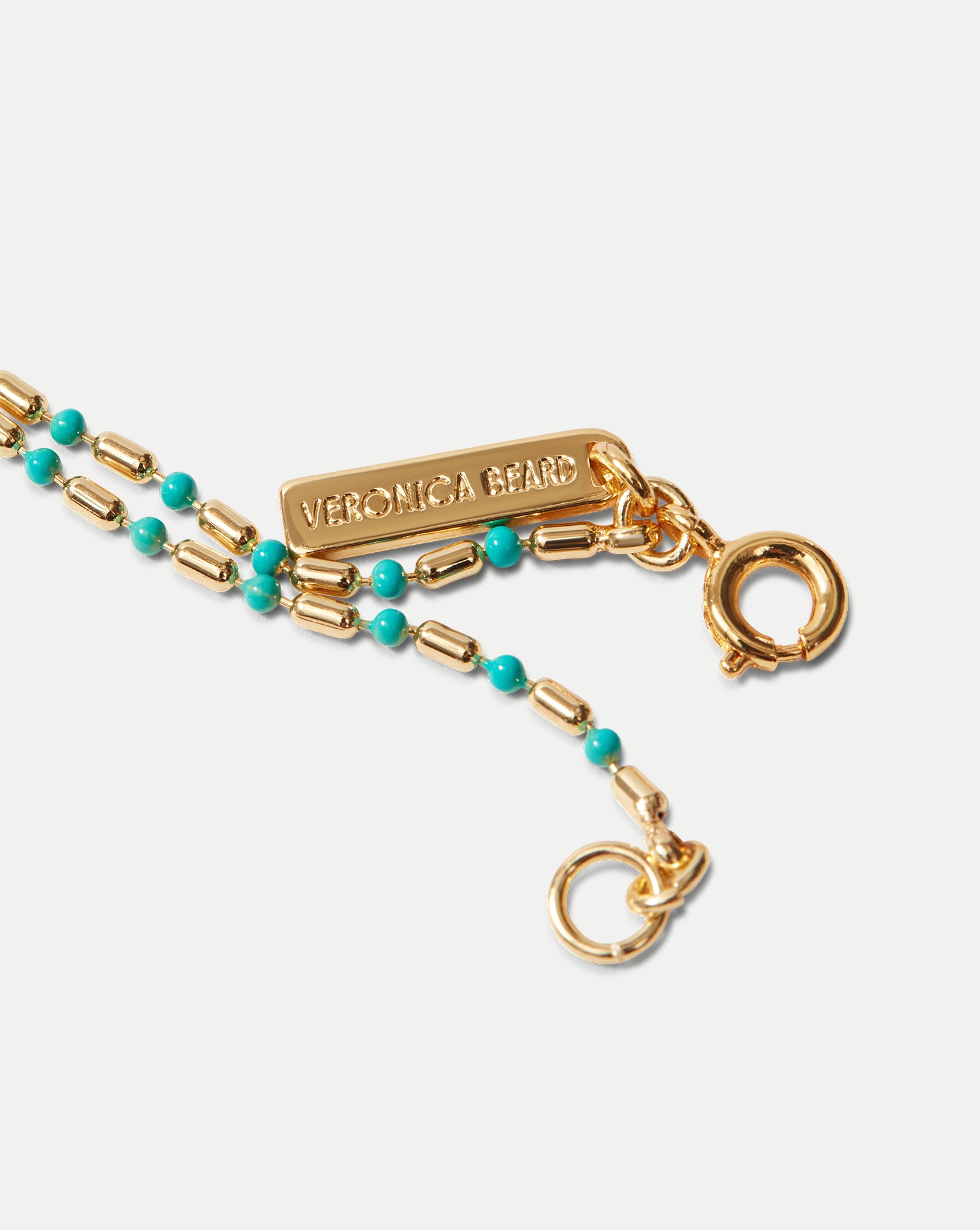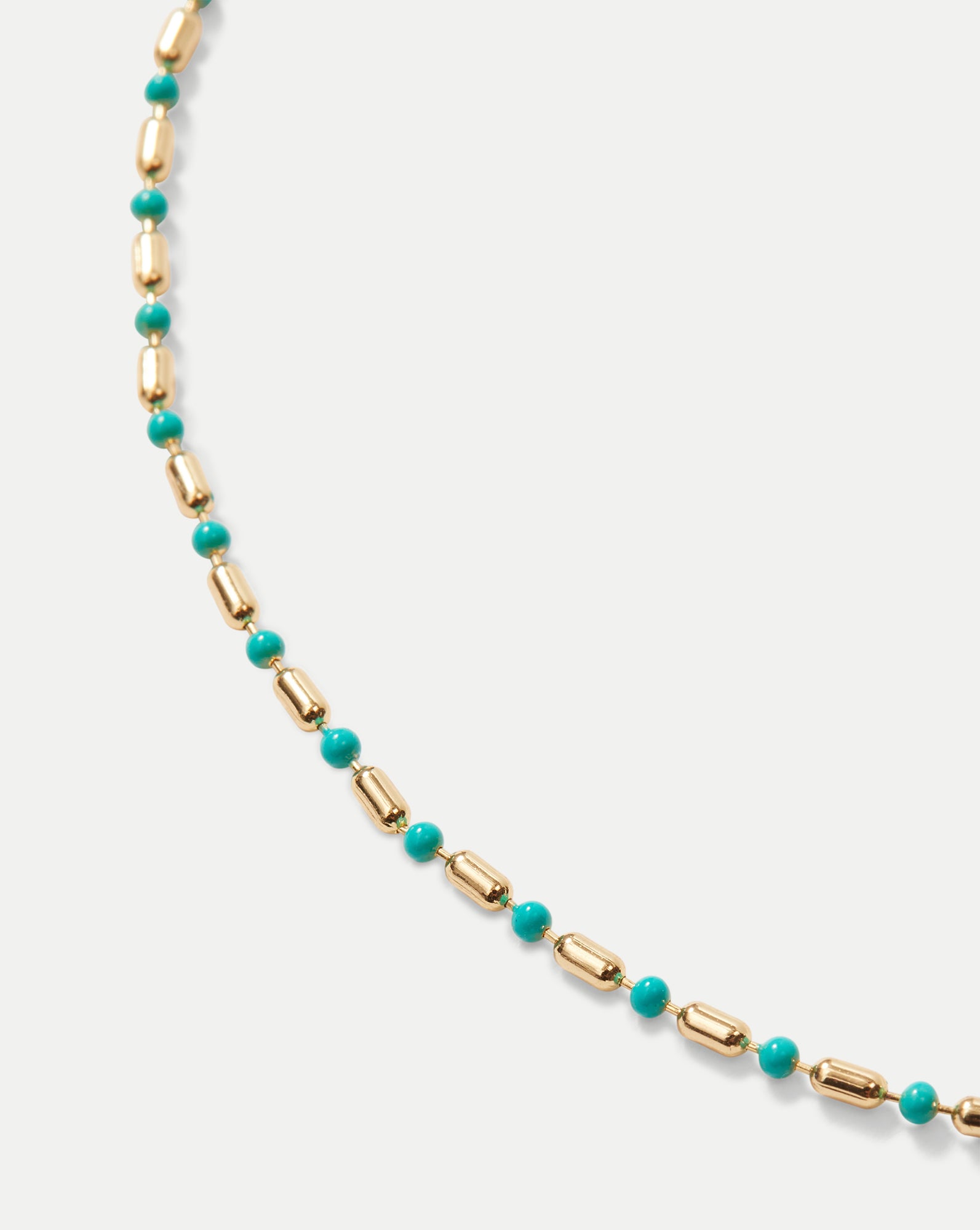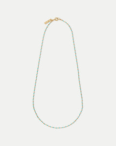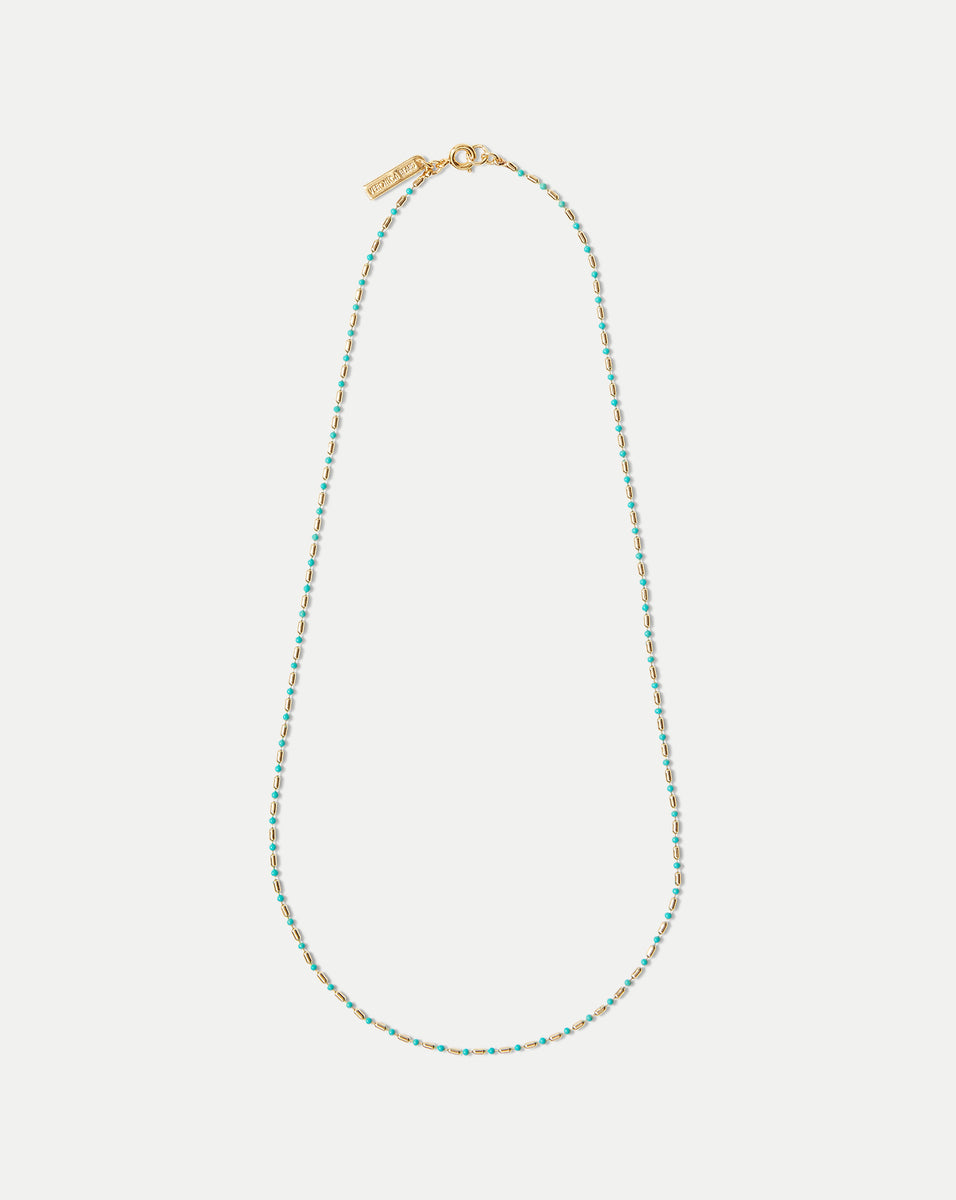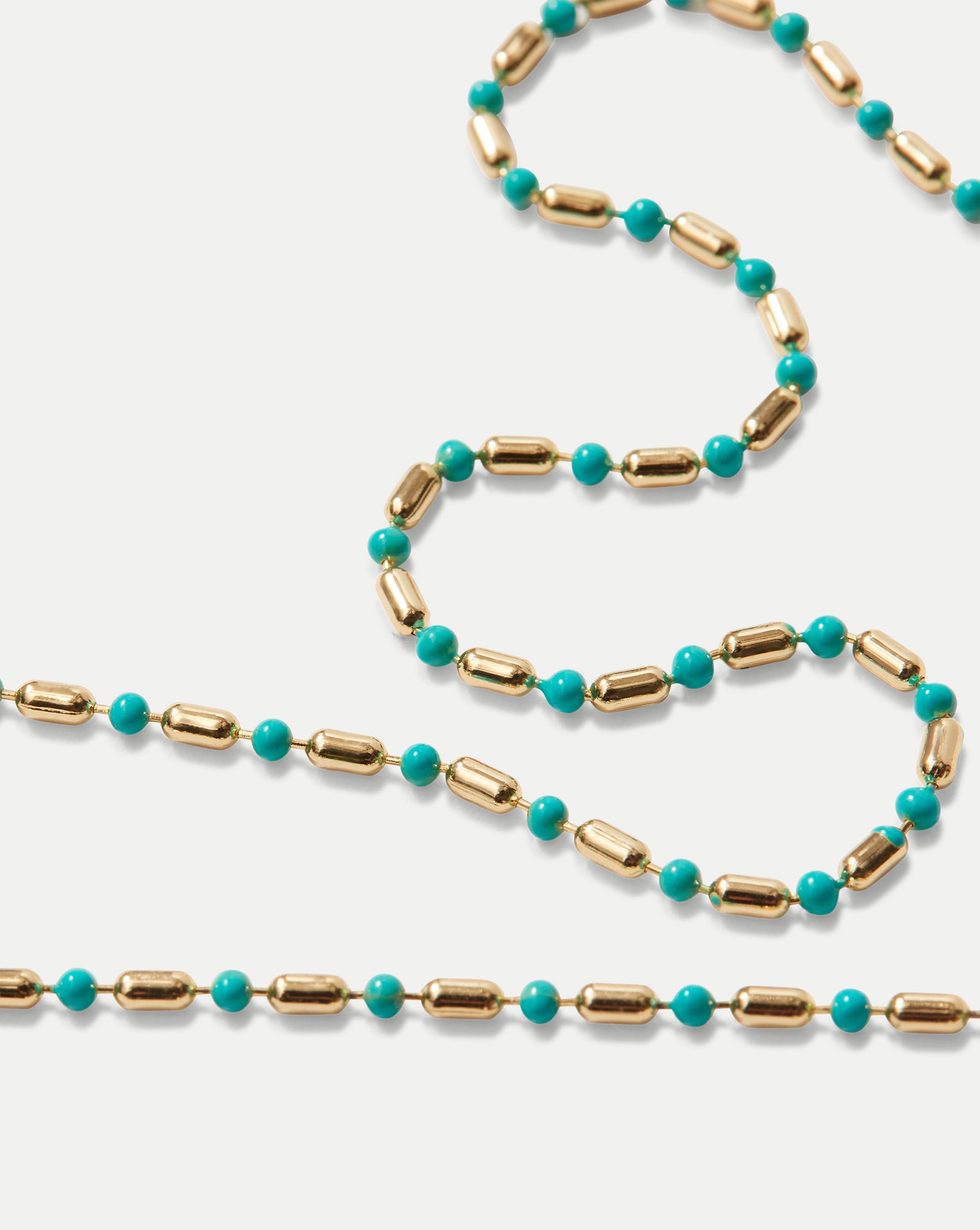 The effortless everyday necklace, made for layering. This dainty, 18-inch chain features a mix of 12-karat gold-plated brass and turquoise enamel-covered beads, securing with a Q clasp for ease. Layer with the Enamel Bead Chain Necklace (or two, or three), mixing and matching colors, and style with your favorite VB tees, tank tops, and swimwear.