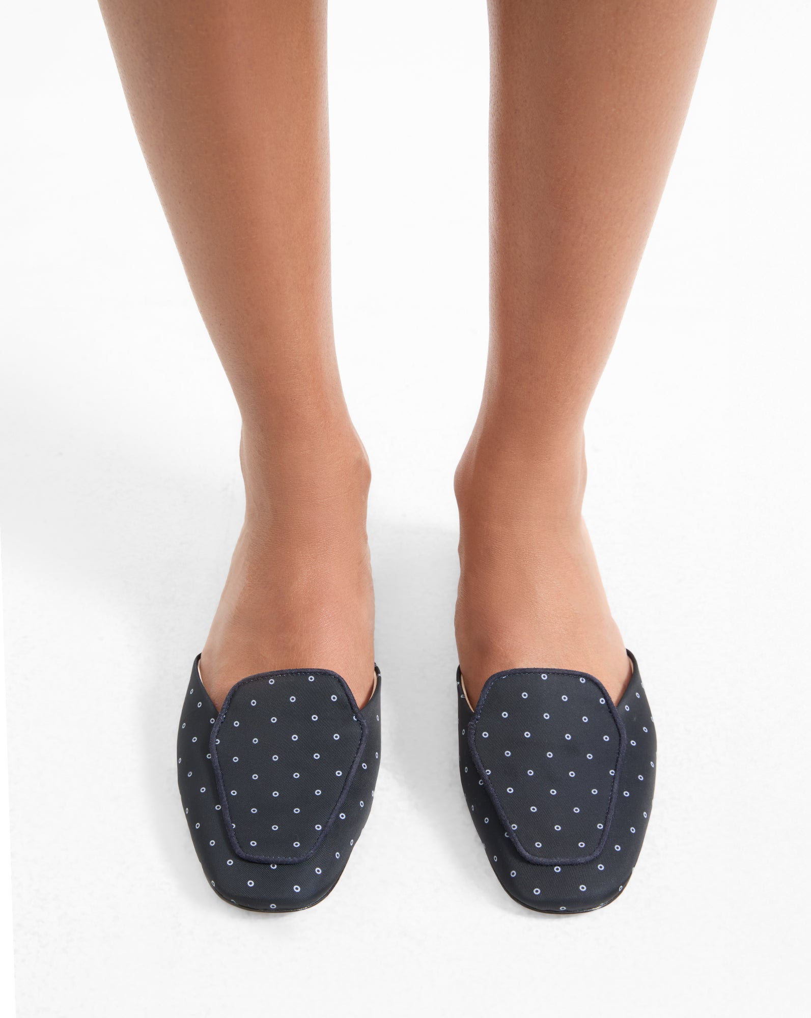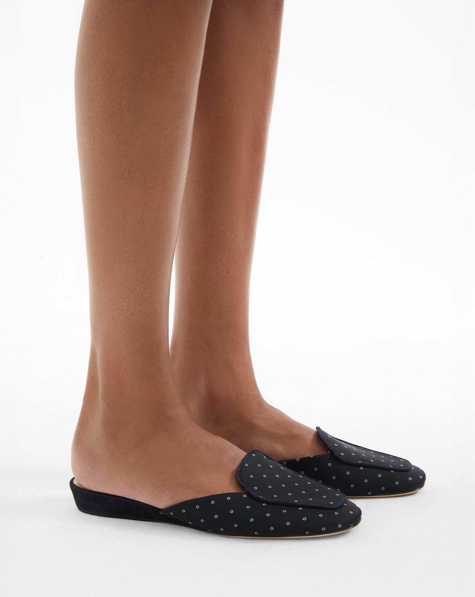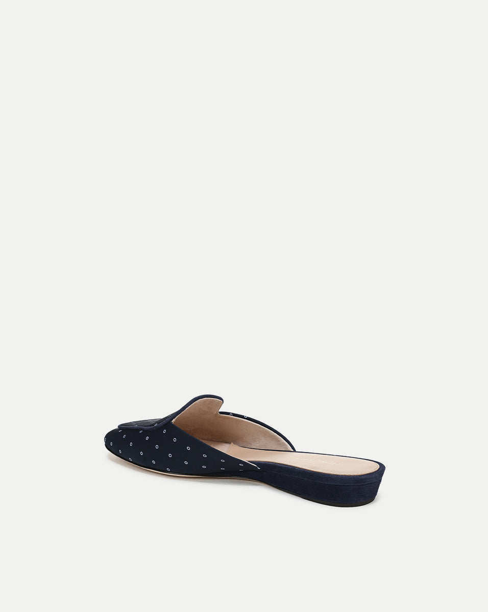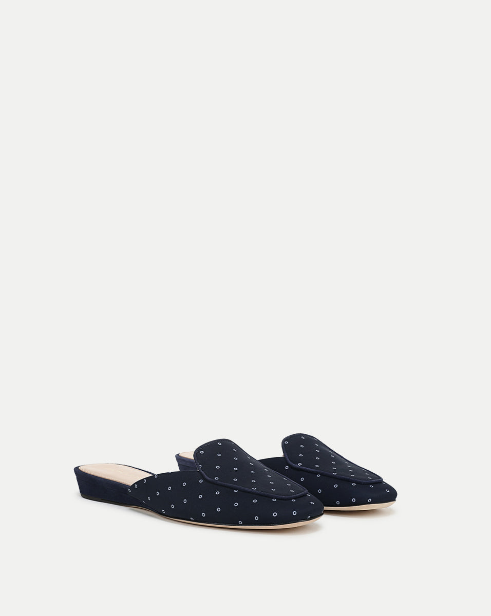 The classic loafer, reimagined for warmer days. Crafted from navy scarf-print faille, the Moritz is a closed-toe mule featuring a minimalist loafer-style upper. Suede piping in chocolate brown adds a refined touch along the vamp, while a half-inch wedge heel provides subtle lift. Pair it with breezy trousers and a linen top for a polished yet relaxed summer look.
