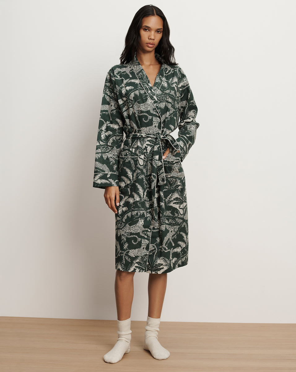The everyday hero every wardrobe needs. Crafted from 100% Global Organic Textile Standard cotton, this lightweight robe features a tropical leopard motif in hunter green. Falling just above the knee, it has a shawl collar with white piped trim, a back yoke, two front patch pockets, and a self-tie belt to cinch the waist. Luxurious yet practical, it’s the piece you’ll reach for first thing in the morning or when unwinding at night.