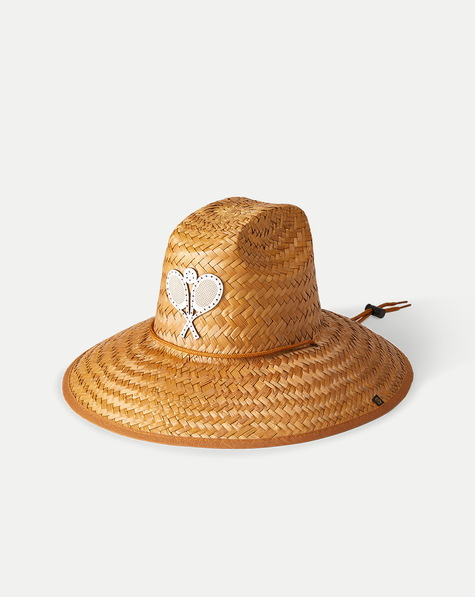 Made from woven straw, this lifeguard hat boasts a graphic tennis emblem in hand-stitched leather. The oversized brim offers ample sun protection while an elastic sweatband and adjustable chin cord ensure superior comfort and fit.
