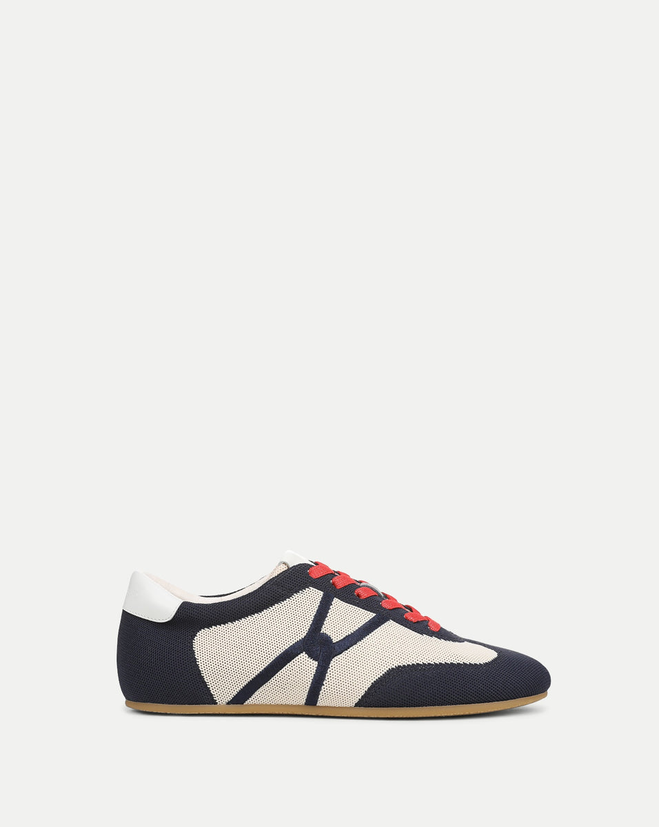 Your go-to for days on the move. Engineered to be a lightweight, everyday sneaker, the Riviera boasts an allover recycled knit body in color-blocked navy blue and ecru—and red laces for bold contrast. A padded leather collar and cushioned footbed provide comfort while the rubber outsole adds grip. Finished with an interlocking-V design—a nod to our logo—it’s the ultimate in sporty chic.