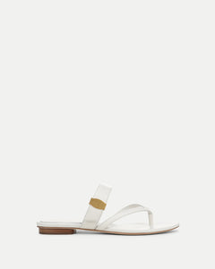 We took the iconic hardware from the Veronica Beard Dash Bag and reimagined it on a sleek, flat sandal. A modern take on the classic flip-flop, the Salva in white leather features a thong toe and a wide upper strap, accented with our signature collar stud buckle in gold for a polished, understated finish. Set on a cushioned footbed, it’s perfect for weekends and warm-weather getaways.