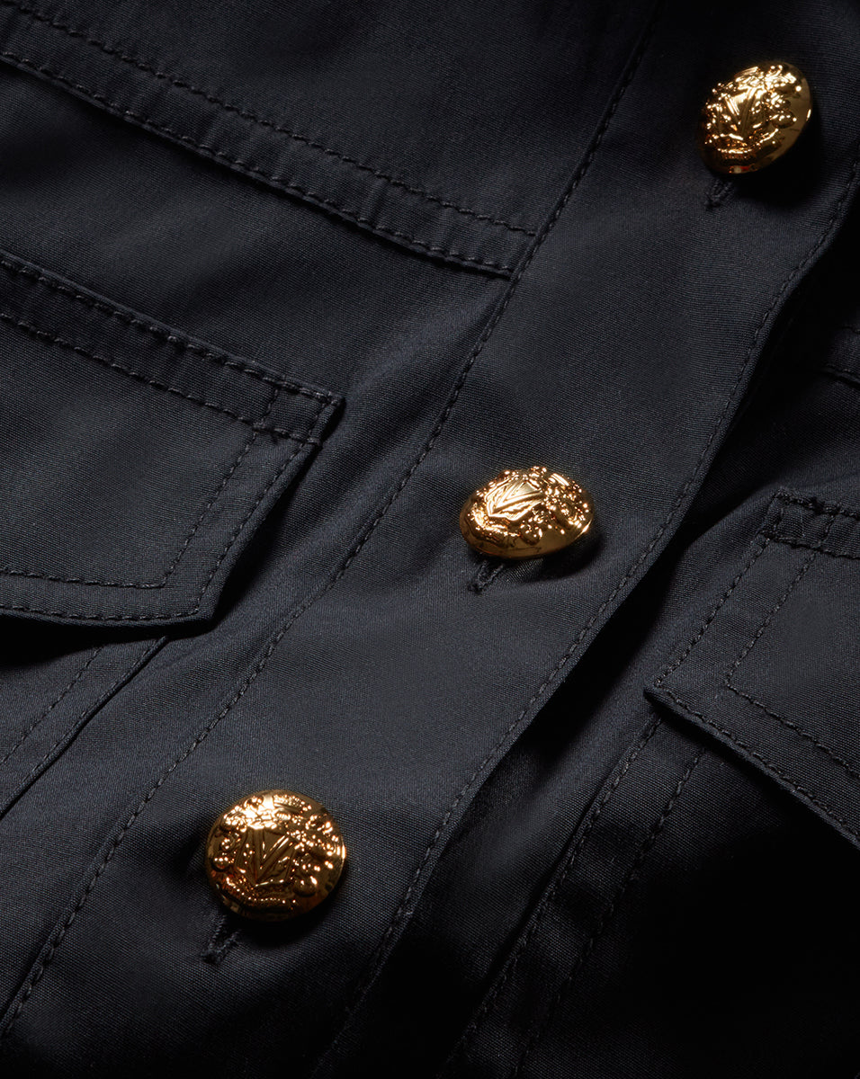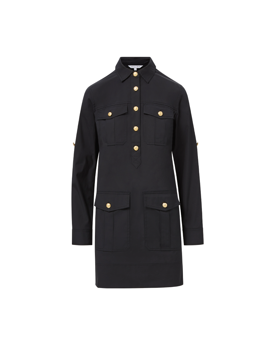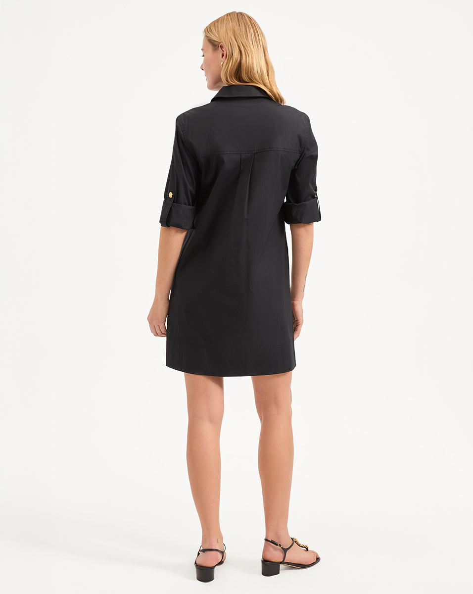 Utilitarian ease. Cut from stretch-cotton poplin, our Saude dress has a relaxed fit and a throw-on-and-go appeal. It’s finished with a neat collar, button-down placket and 4 patch pockets. Inner tabs inside the sleeves allow for easy rolling. In ultra-versatile black, this shirtdress can take your to work, to date night and everywhere between.