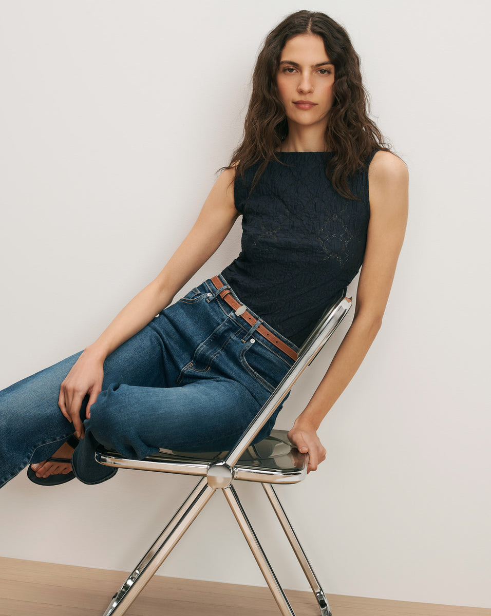 The Selah tank top in navy is a wear-forever style, crafted from delicate cotton lace—with stretch for ease. The streamlined, body-skimming silhouette features a boat neck, side ruching, and a diamond-lattice knit pattern that adds quiet dimension. Effortless, chic, and endlessly versatile, it's a great day-to-night go-to.