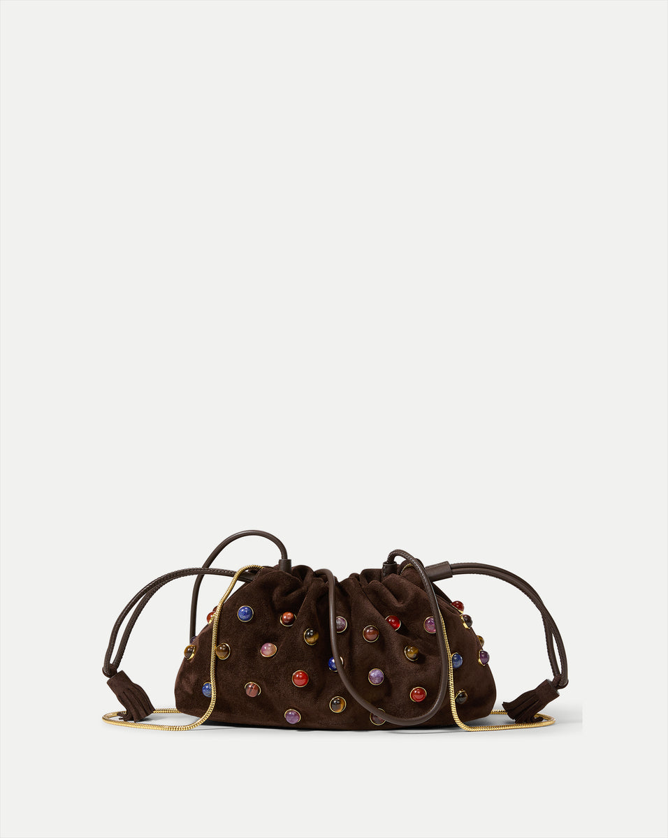 A petite, statement-making take on our classic Stash bag. Crafted from premium Italian suede in dark brown and embellished with natural cabochon stones, this pouch features a softly structured silhouette with a gathered, cinchable top, finished with leather tasseled drawstrings at both ends. Two straps—one in smooth leather, the other a gold snake chain—offer maximum versatility. Inside, a zip pocket and magnetic tab closure keep your essentials secure.