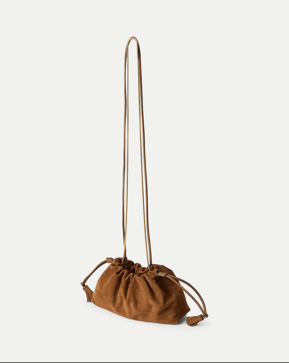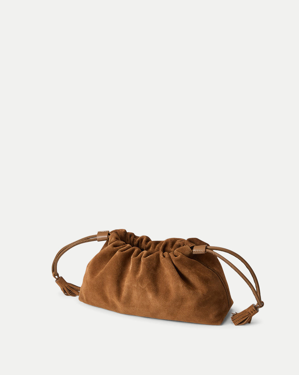 A petite take on our original Stash bag—that's still roomy enough to fit the largest iPhone. Crafted from tan Italian suede, this pouch bag features a soft silhouette with gathering up top and double straps finished with tassels. An interior zip pocket and magnetic tab closure keeps your belongings safe and secure.