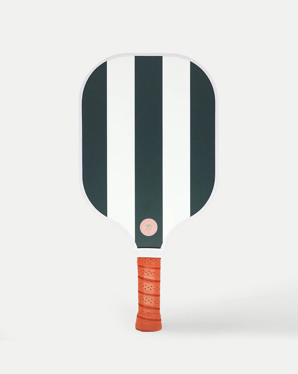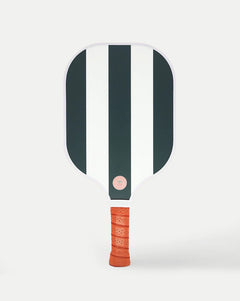 A statement paddle to step up your pickleball game. Engineered for power and accuracy, it features a lightweight body, an elongated face for improved power, a durable honeycomb core, and a fiberglass surface to boost the “pop” on your shots. Finished with dark green and white stripes, it’s as chic as it is high-performance—designed to complement your on-court looks. Paddle and Palm is a family-owned Pickle Ball accessories brand that aspires to bring style and sophistication to the sport.