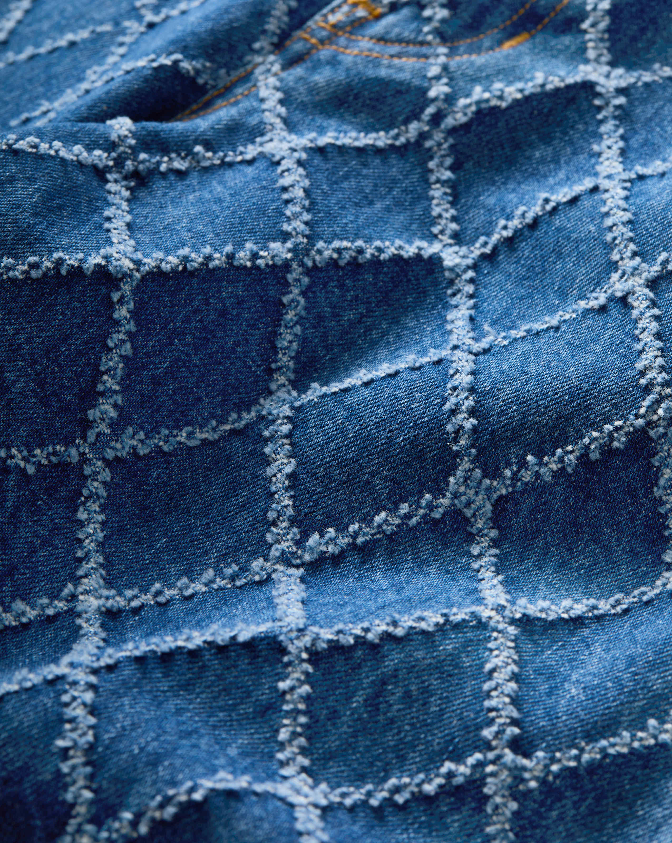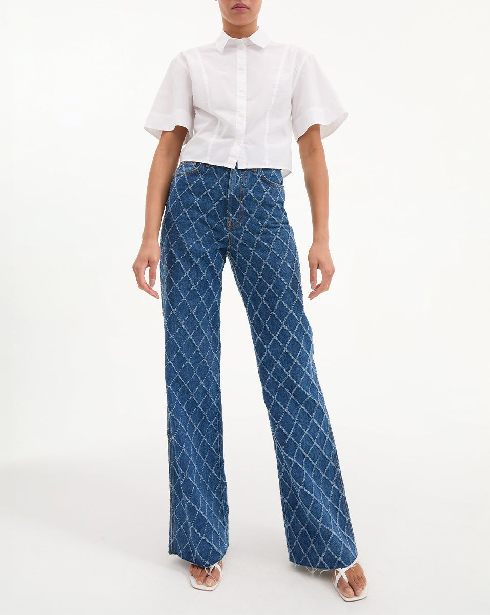 The Taylor jeans you know and love—now boasting a graphic, laser-printed diamond pattern. Made in LA from non-stretch Italian dark blue denim, it features a high-rise waist and a wide-leg silhouette that falls to a raw-edged hem. Pair these wide-leg jeans with a simple button-down for an off-duty statement look.