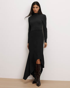Meet the Thalissa—the latest addition to our mixed media lineup. The top: a long-sleeved mock neck, cut in softly ribbed stretch cotton. The bottom: a romantic, fluid handkerchief skirt with a front slit. Finished with a side-zip closure for ease, it’s the dress you’ll reach for when effortless elegance is the goal—just add heels and go.