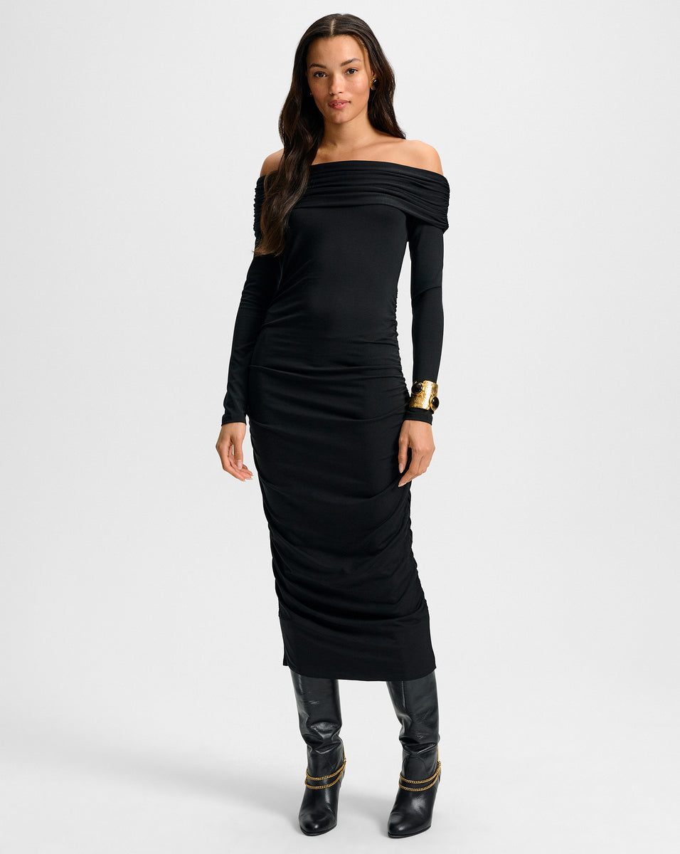 Your go-to for date night. The Tinette long-sleeve midi dress is designed with a flattering bodycon silhouette and a flirty off-the-shoulder neckline. Ruching along the sides creates soft draping through the skirt, adding a feminine finish. Perfect for evenings out or event dressing, just add a strappy heel or boot to complete the look.