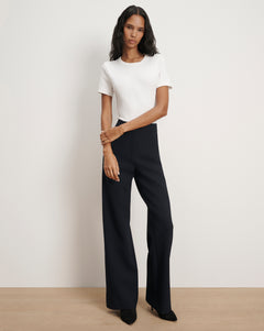 A seasonless, timeless classic. Expertly tailored in a premium stretch blend, the Tonelli pant features a relaxed wide-leg fit and a high-rise, flat-front waist for a clean, streamlined silhouette. Side slant pockets complete the look. Style these navy pants with a simple tee to elevate the everyday—or the coordinating Miller jacket for a chic suiting moment.