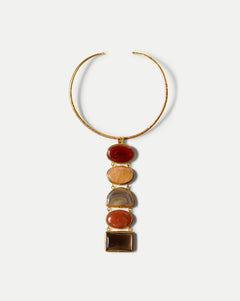 The piece that inspired the full Veronica Beard x Sylvia Toledano capsule—colorful, meticulously crafted talismans that embody a luxe bohemian spirit and complement our Fall 2025 collection. Designed in Paris and handcrafted in India from 22k gold-plated brass, the Torque is a bold, sculptural collar necklace featuring a vertical pendant of five bezel-set semi-precious cabochons sourced from Jaipur: carnelian, golden jasper, natural onyx, red aventurine, and smoky quartz. A striking statement piece, it’s destined to be the focal point of any look.