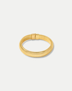 A bracelet to elevate the everyday. This wide, Tubogas-style bracelet is constructed with fine, interlocking 12k gold-plated brass strips, creating fluid movement and flexibility and a ribbed-like finish. Finished with a box clasp for effortless wear, it’s the perfect finishing touch to any look.