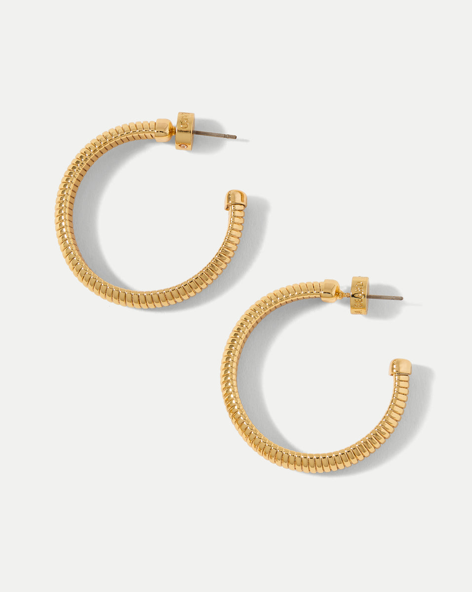 The essential hoop—now with a cool, textured finish. This chunky, Tubogas-style earring is constructed from fine, interlocking 12k gold-plated brass strips for a ribbed-like effect. It’s finished with a surgical steel post—ideal for sensitive ears—and a barrel back for comfort and ease. Endlessly versatile, wear it day or night.