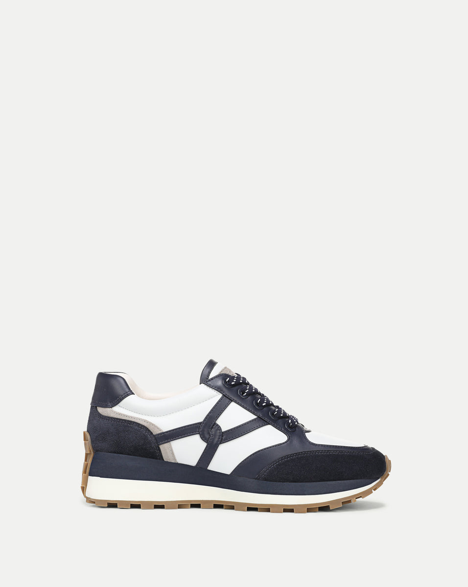 The best-selling Valentina sneaker combines flattering lines and comfort—with a two-inch lift. Made from suede and leather in graphic navy blue and white, the style features a padded collar and a cushioned midsole for all-day comfort while the rubber outsole provides traction and grip. Patterned laces and an interlocking-V design—a nod to our logo—complete the look. Sporty and chic, it’s made for both getaways and every day.