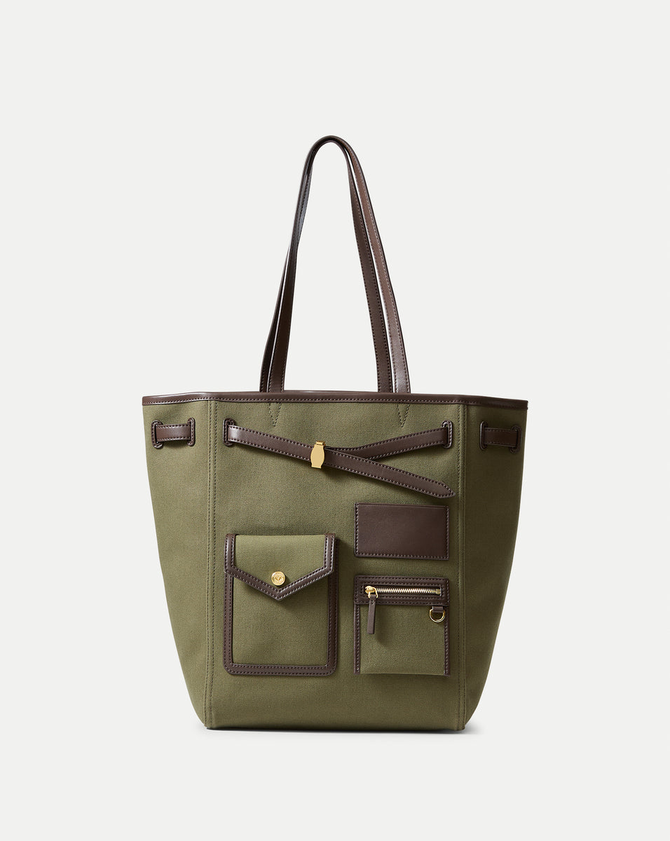 Our best-selling, go-anywhere Dash Tote Bag—now updated with statement cargo details. Crafted from heavyweight Italian canvas and lined with soft microsuede, it features our signature adjustable leather belted strap and gold-toned hardware, accented with a front flap patch pocket, zippered pocket, and leather patch pocket for a utilitarian edge. Spacious enough for all your essentials and then some, the boxed bottom allows it to stand upright for easy access, while interior zip and slip pockets keep smaller items organized and secure.