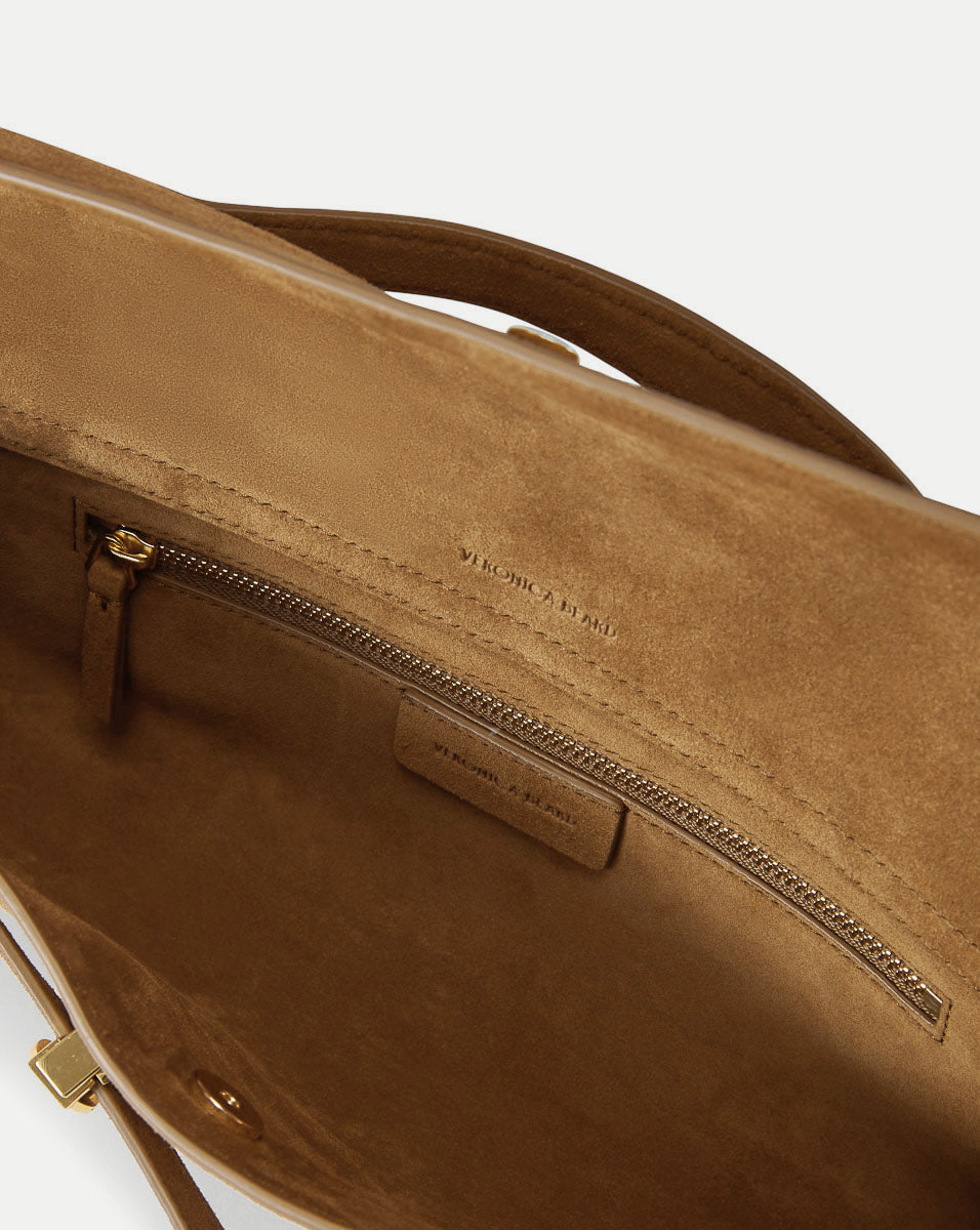 Our popular Dash bag, now in a clutch. Made from tan Italian suede, it carries the essentials you need—including the largest iPhone—and features a slim top handle and an adjustable belted strap. An interior zip pocket keeps cash and credit cards organized and secure, while the removable suede strap adds hands-free versatility.