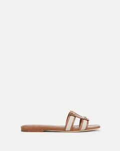 The quintessential sandal every wardrobe needs. Expertly crafted from tan leather with natural canvas accents, the Via open-toe slide features a minimal multi-strap silhouette, finished with gold hardware. Equal parts polished and effortless, it’s the shoe that goes with everything, from day to night and week to weekend.