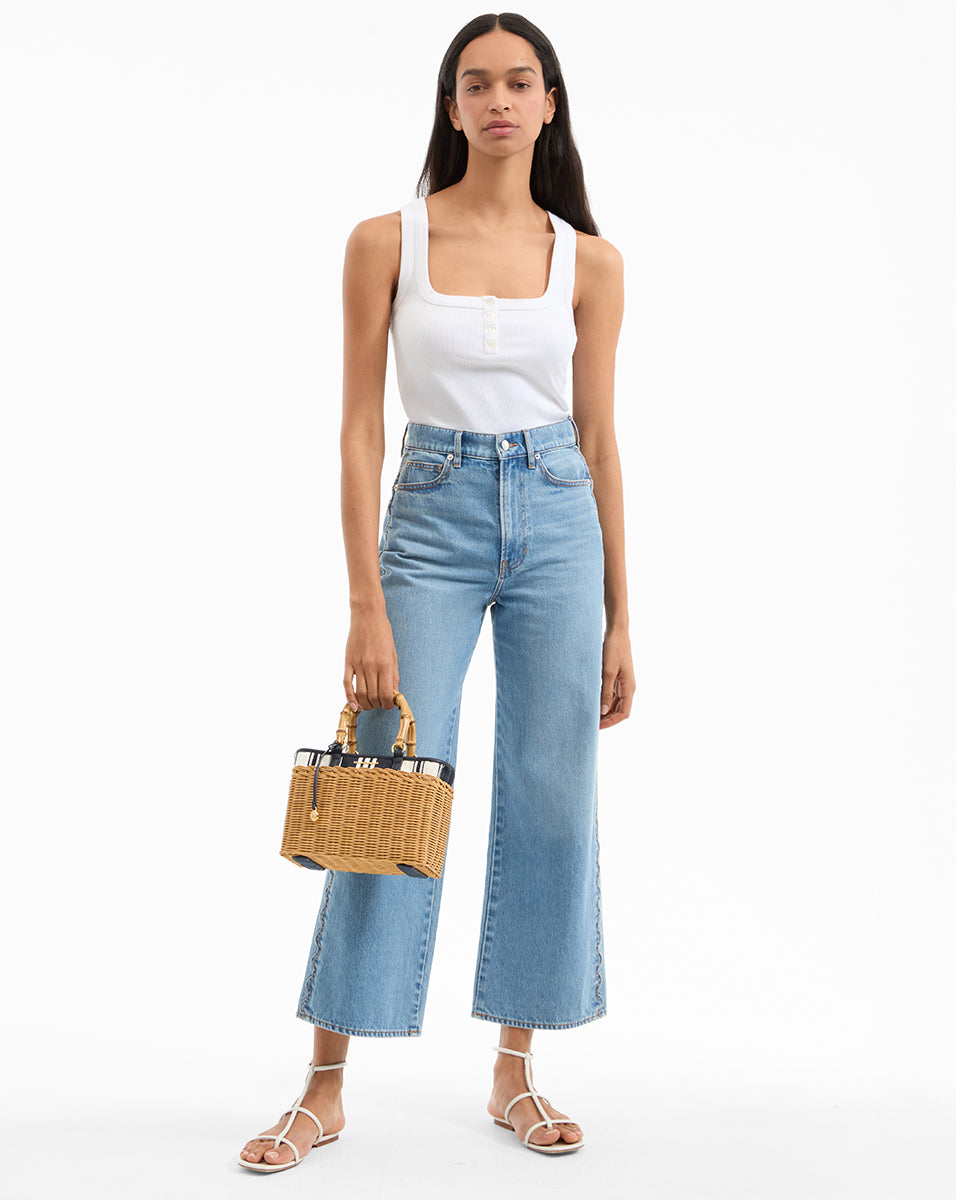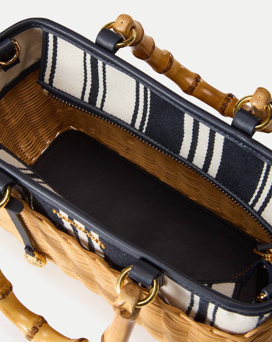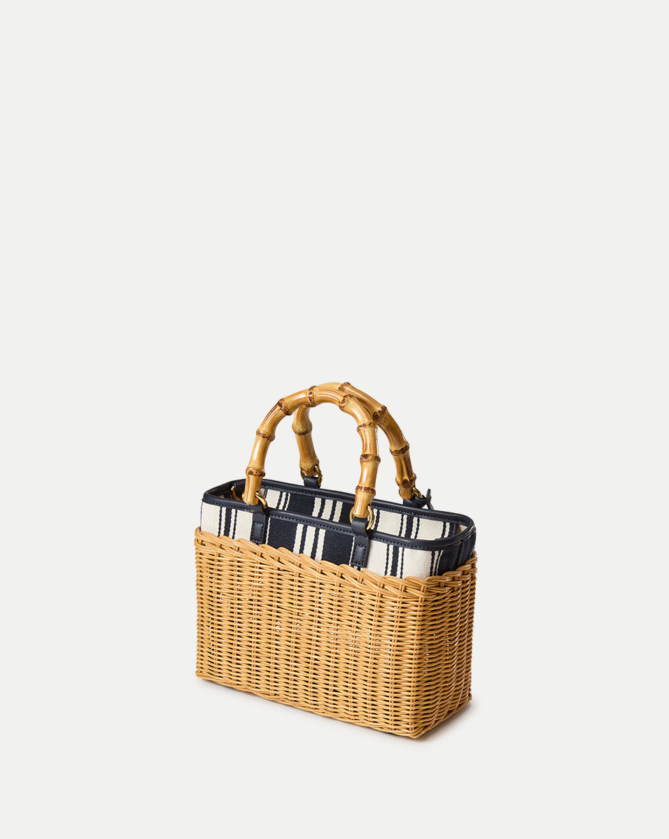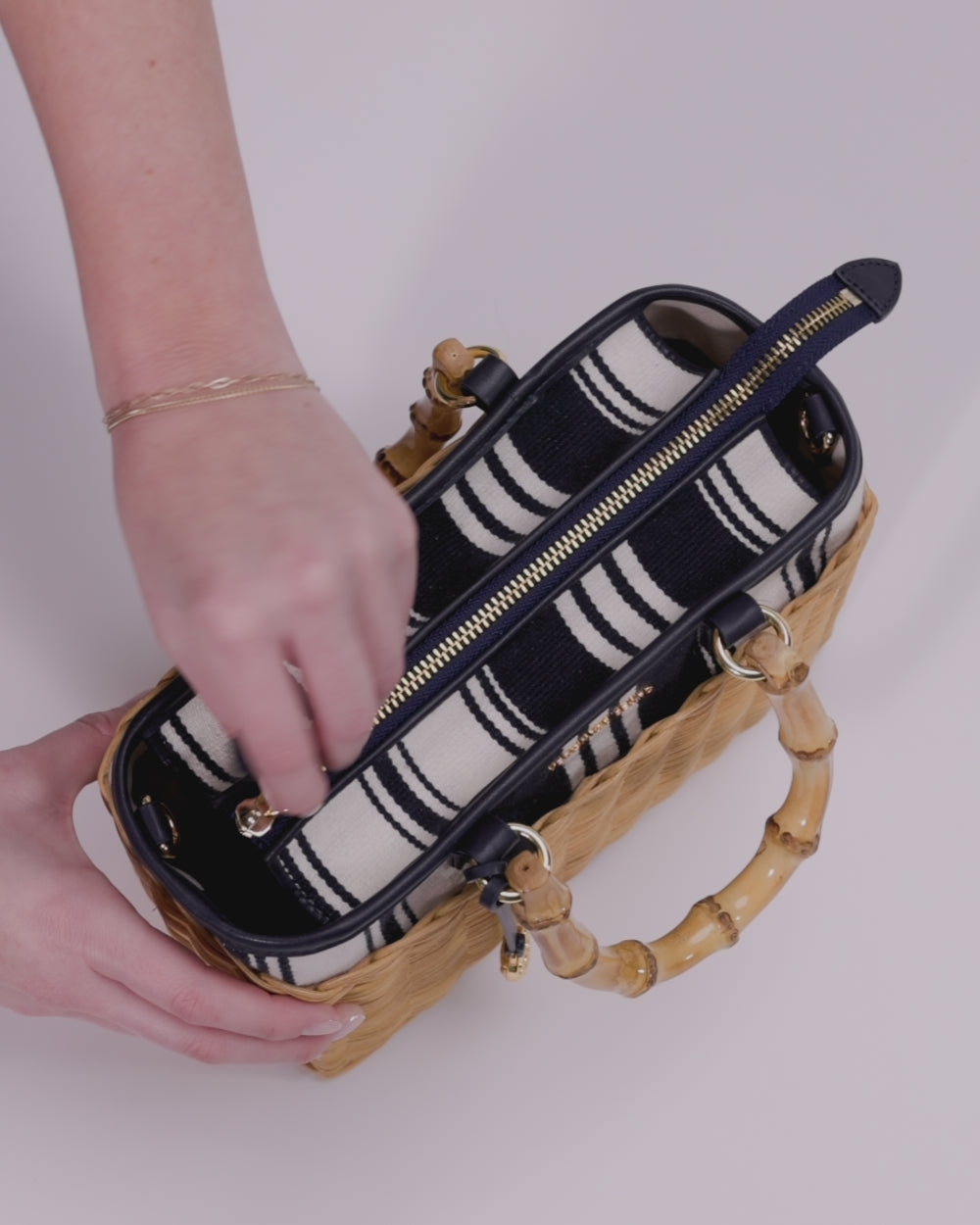 Spring, in handbag form. The Porto is a wicker mini box bag, handwoven from natural rattan. It’s trimmed with nautical navy and white canvas and finished with natural bamboo top handles, adding to its warm-weather appeal. A top zipper secures your belongings, while a removable, adjustable crossbody strap in matching navy leather adds hands-free versatility.