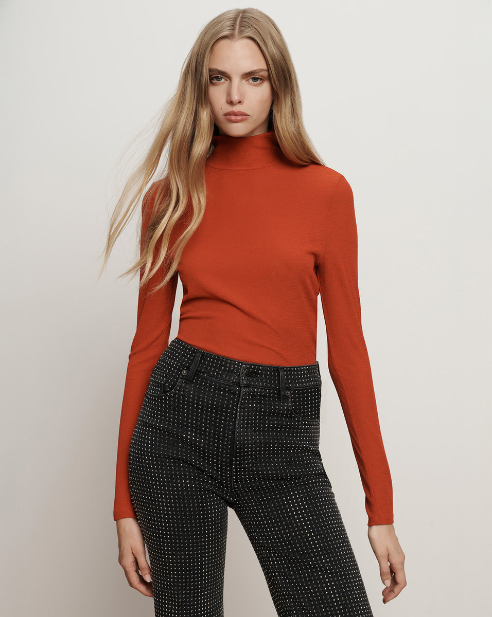 A foundational piece you’ll reach for again and again. The Wyeth is crafted from a delicate, semi-sheer stretch knit that hugs the body for a slim, second-skin fit. With a high, fitted turtleneck and clean-finished cuffs, this carnelian red top perfect on its own or layered under blazers, cardigans, or knits.