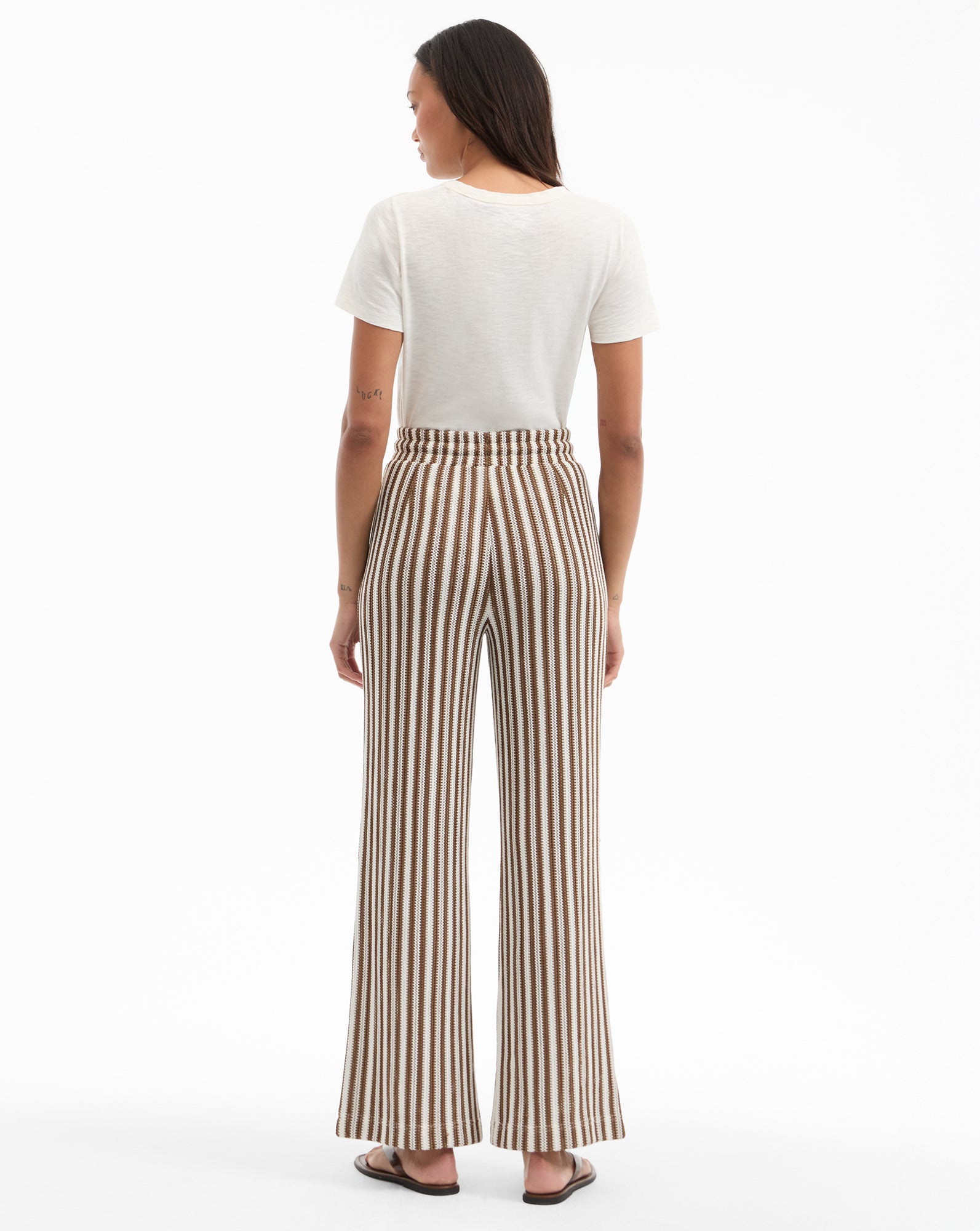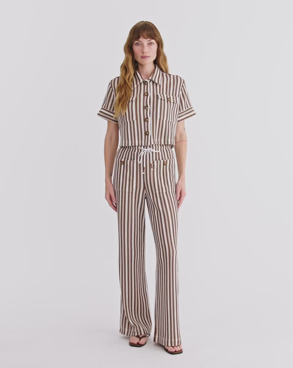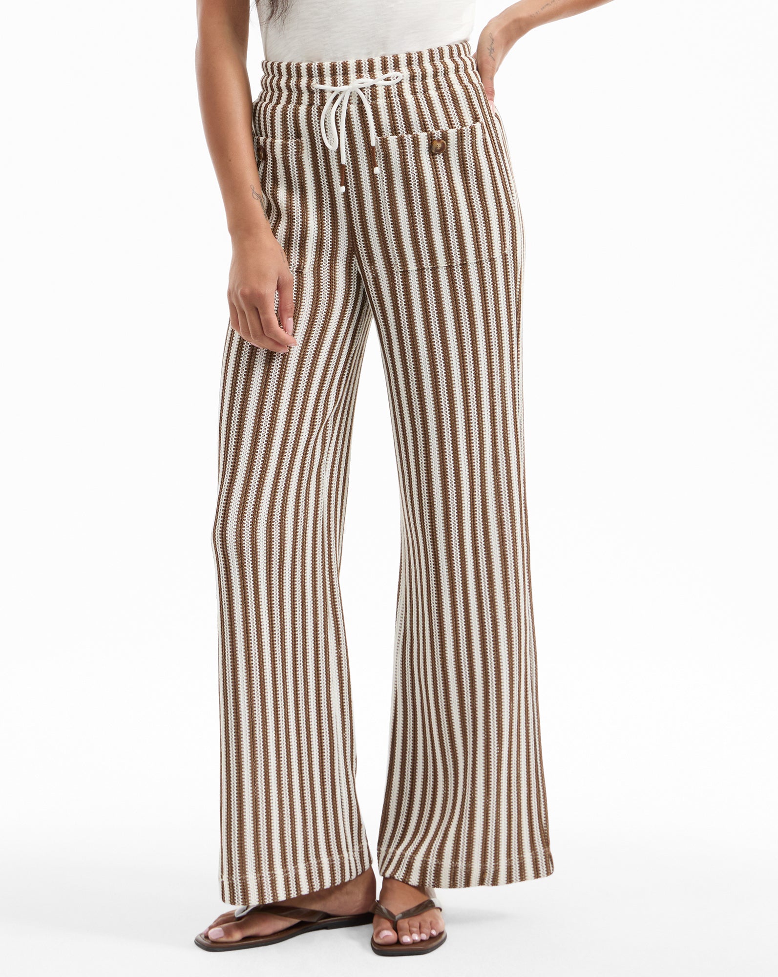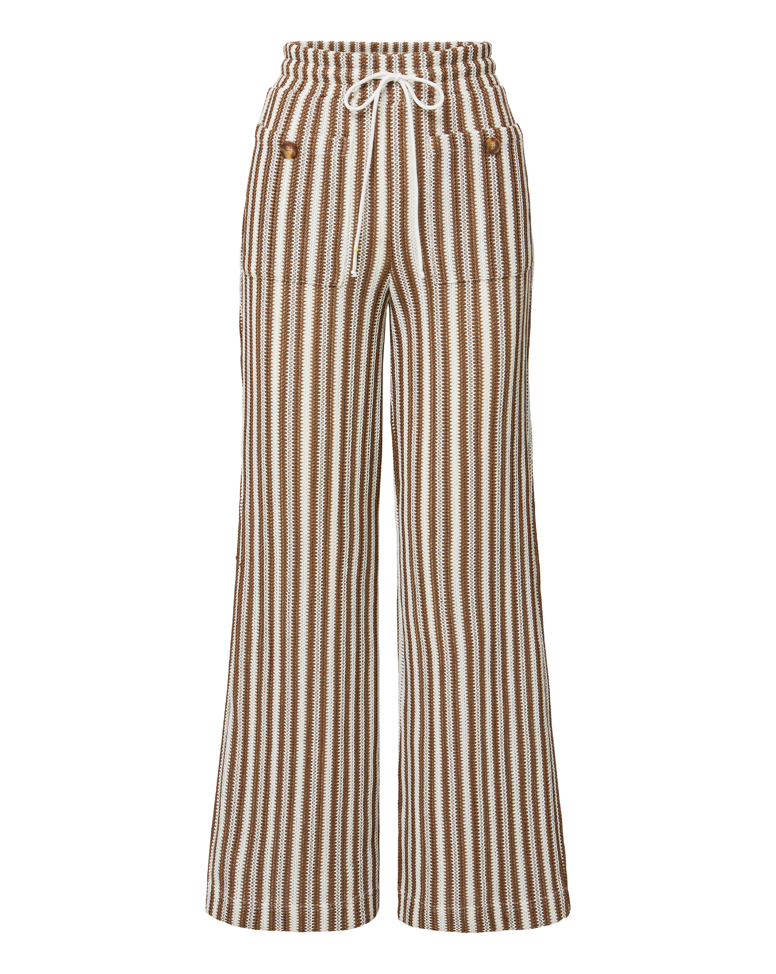 The ultimate off-duty pant. Expertly crafted from a lightweight stretch knit, the Zosia pant features bold white and brown stripes, an elastic drawcord waist, and front patch pockets. The relaxed wide-leg silhouette adds to the laidback vibe—just pull on and go. Style with the coordinating Bouvier top for a matching set that's equal parts effortless and chic.